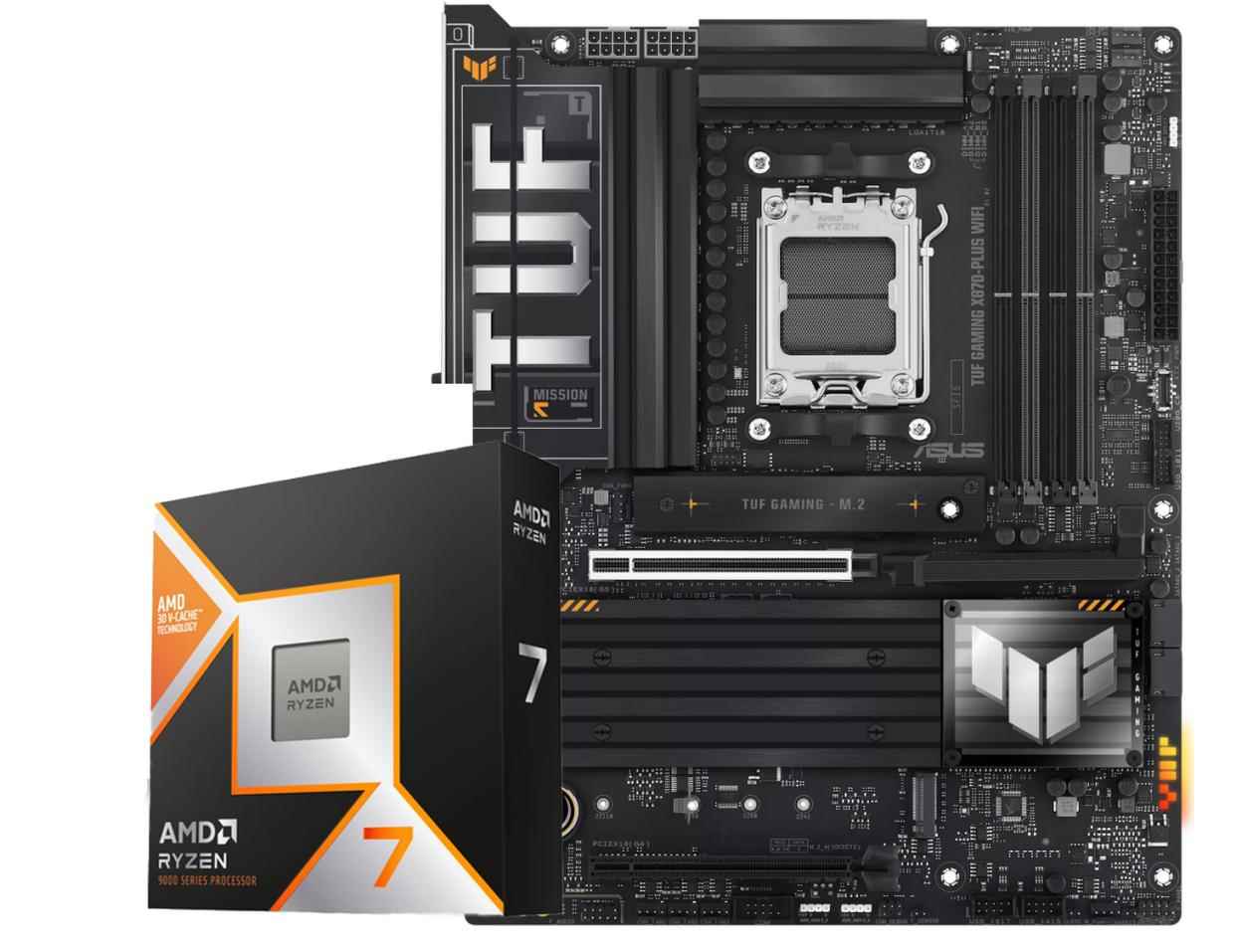 本次我们选择了华硕tuf x870-plus wifi和锐龙7 9800x3d进行搭配,这款产品采用了uf gawing系列军事风格外观设计,通过大面积散热装甲和银色金属logo、文字的装饰,整体风格硬朗又有明显金属质感。