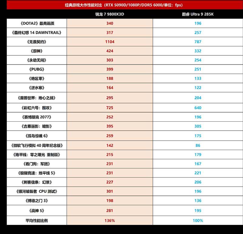 从实际游戏测试成绩来看,锐龙7 9800x3d全面胜过竞品最新的的旗舰产品酷睿ultra 5 285k,21款游戏平均领先的幅度达到了36%,可以说是跨级别的领先,优势非常的明显。前面我们说过,锐龙7 9800x3d由于满载功率远低于酷睿ultra 9 285k,因此在主板供电、散热器和电源方面的要求非常宽松,有助于控制装机成本。