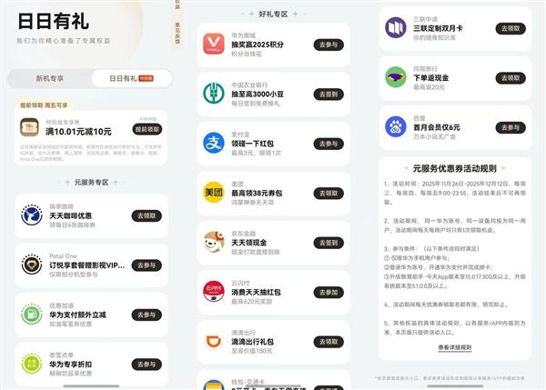 随着新品的发布,华为负一屏也同步面向鸿蒙5.1及以上设备再次推出鸿蒙有礼特别版:即日起至12月12日,每周三、四、五可领取一张满10.01元立减10元的元服务优惠券,每周五可核销,用户不仅可以在中免日上元服务购小样,还可以在美团外卖、瑞幸、奈雪、猫眼、同程等覆盖吃喝玩乐的多个元服务使用10元的减免券。无论是午餐外卖加餐、还是周五与同事的甜甜下午茶、亦或是周末与好友相约《疯狂动物城2》,都可以桌面右滑进入负一屏,提前抢券周五下单,省钱还方便。