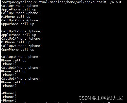 }代码运行结果如下,可以看到,调用 callup1() 和 callup2() 能体现出多态的特点,分别调用的是类自己的 callup();callup3() 没有体现多态,调用的都是基类的虚函数。引用传递和指针传递都能体现多态的特点;值传递不能体现多态的特点,还是调用的基类中的函数。