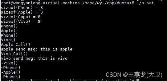 如下代码, phone 是一个基类,类中有一个虚函数 virtual boid callup()。phone 派生出 3 个类,applephone,miphone,oppophone。在 main 函数中针对 3 个派生类,分别创建了一个对象。定义了 3 个函数 callup1(),callup2(),callup3(),3 个函数的形参分别是 phone 引用,phone 指针,phone 对象,在 main() 函数中分别调用这 3 个函数。