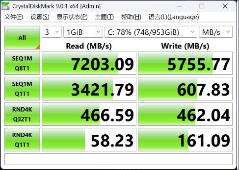 该机标配的是1tb pcie4.0 tlc颗粒ssd,实测连续写入速度达到了7203mb/s,连续读取速度达到了5755mb/s——性能强的ssd,代表着日常使用响应极速无卡顿。
