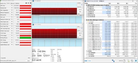 室温15℃左右,大师模式下,对暗影精灵11锐龙版进行双考测试,半小时之后的情况如下所示:锐龙9 8945hx功耗约55w,温度77℃,rtx 5060持续输出功耗约115w,温度约78℃,整机性能释放约为170w。