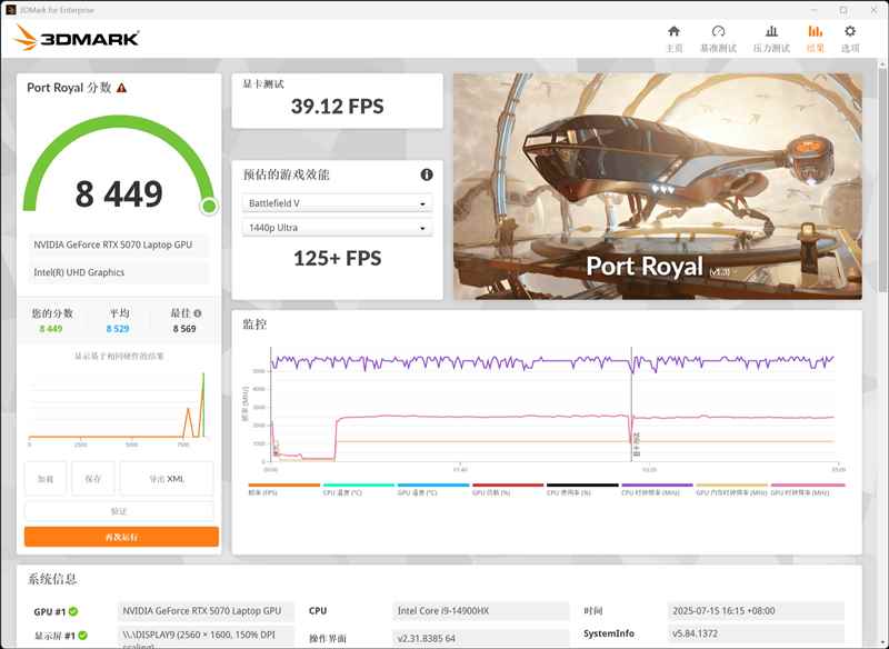 在3dmark中测试实时光追性能的prot royal测试中,总成绩为8449,其中显卡测试成绩为39.12fps。