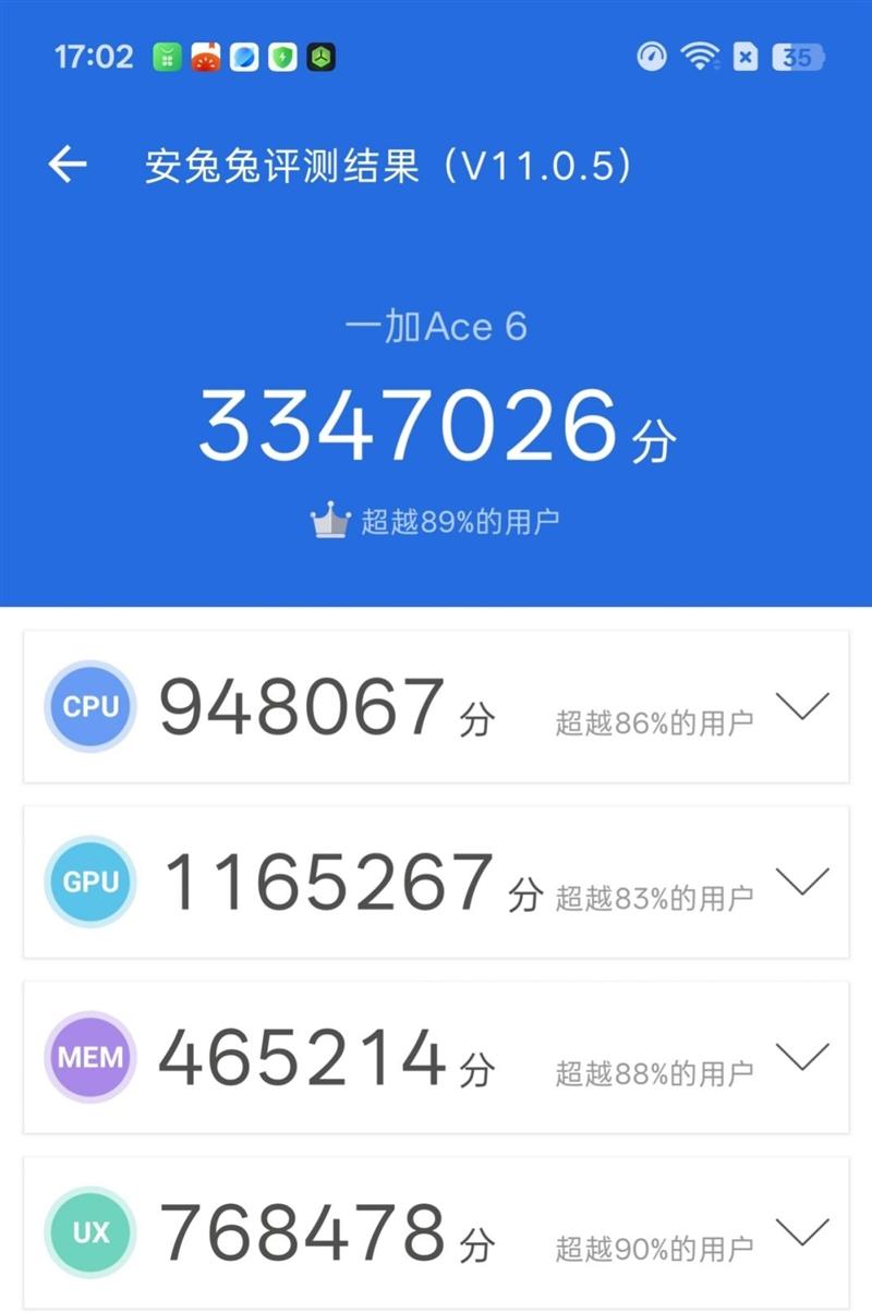 安兔兔v11的跑分达到了334w分,cpu+gpu分数达到了211w分,是搭载骁龙8至尊版的机型中最顶级的一批。