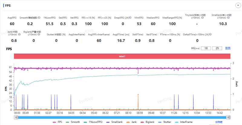 《王者荣耀》进行一局120帧极致画质5v5回放,平均帧数120.1fps,稳帧指数0.1,1%low帧110fps。1%low帧相当强悍,游戏运行十分顺畅,除了在两场大型团战中略有掉帧意外,其余几乎是一条直线。