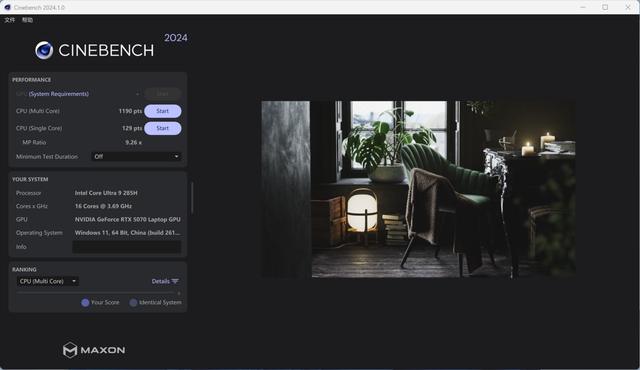 我们通过cinebench 2024来看看这台机器的性能表现。在这个测试中,荣耀magicbook pro 16 2025 hunter取得129pts的单线程成绩和1190pts的多线程成绩。对比来看,酷睿ultra 9 285h处理器的单线程性能超越酷睿i9-14900hx处理器(128pts),表现不错。