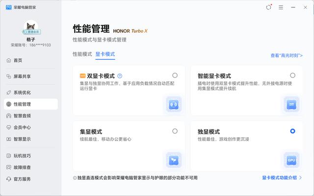 另外,这款gpu还集成最新的第五代tensor core和第四代rt core,并支持dlss 4,这使其在ai计算和光线追踪性能上取得了长足的进步。荣耀magicbook pro 16 2025 hunter支持动态双显三模,玩家可以在《荣耀电脑管家》中手动切换独显的输出模式,以满足不同的使用场景。