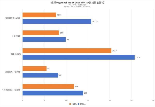 对于cs2这类热门电竞游戏而言,荣耀magicbook pro 16 2025 hunter的表现更是可以用“生猛”来形容。在1440p分辨率下,这台机器在cs2中的平均帧率能够轻松达到203.7fps,这为玩家提供了丝滑的操控体验。