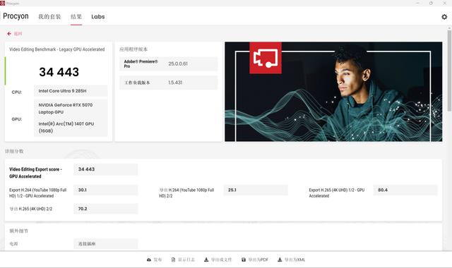 荣耀magicbook pro 16 2025 hunter不仅仅是一台游戏利器,更是一个高效的创意工作站。在ul procyon视频编辑测试中,这台机器得到了34443的总分,意味着用它来进行视频剪辑是毫无问题的。在实际测试中,荣耀magicbook pro 16 2025 hunter剪辑4k视频时,回放没有出现卡顿和丢帧的现象,导出视频的效率也相当高。