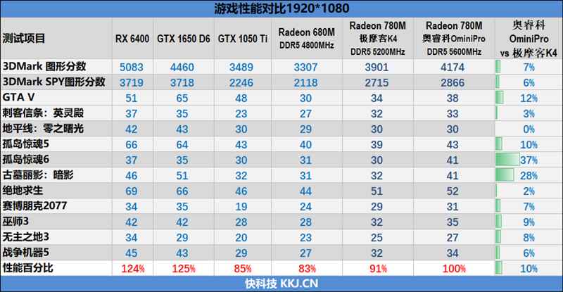 和独显相比,奥睿科ominipro的性能已经超越gtx 1050 ti,领先幅度约为18%。与rx 6400和gtx 1650 d6这样的独显相比,差距也只有25%左右。