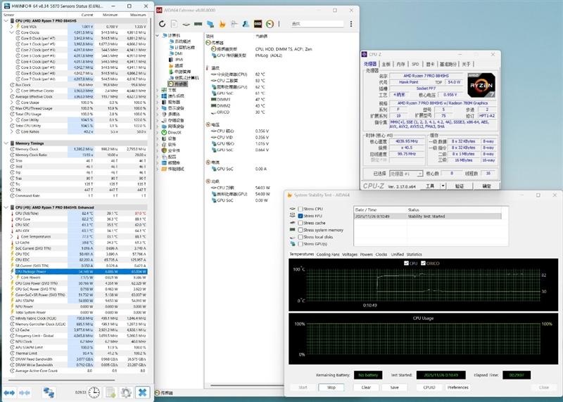 我们使用aida64 fpu进行了长达半小时的烤机测试,奥睿科ominipro可以稳定54w的性能释放,锐龙7 pro 8845hs全核频率4ghz,温度82度。