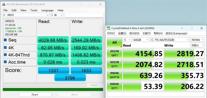 as ssd benchmark总分为3796,顺序读写分别为4029mb/s、2544mb/s、4k随机读写分别为62mb/s、169mb/s。