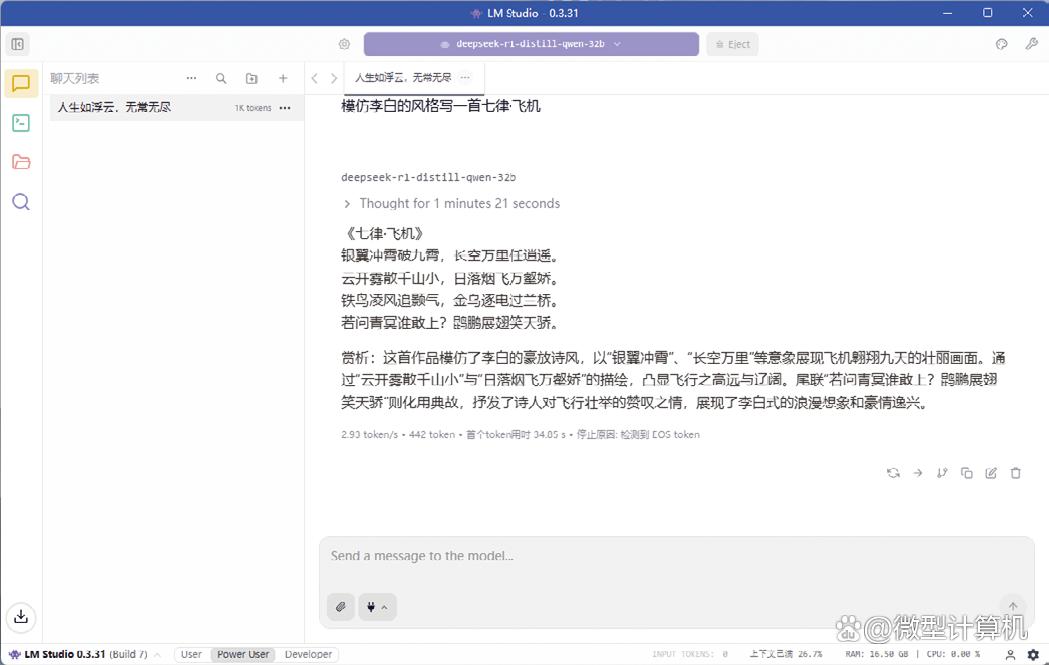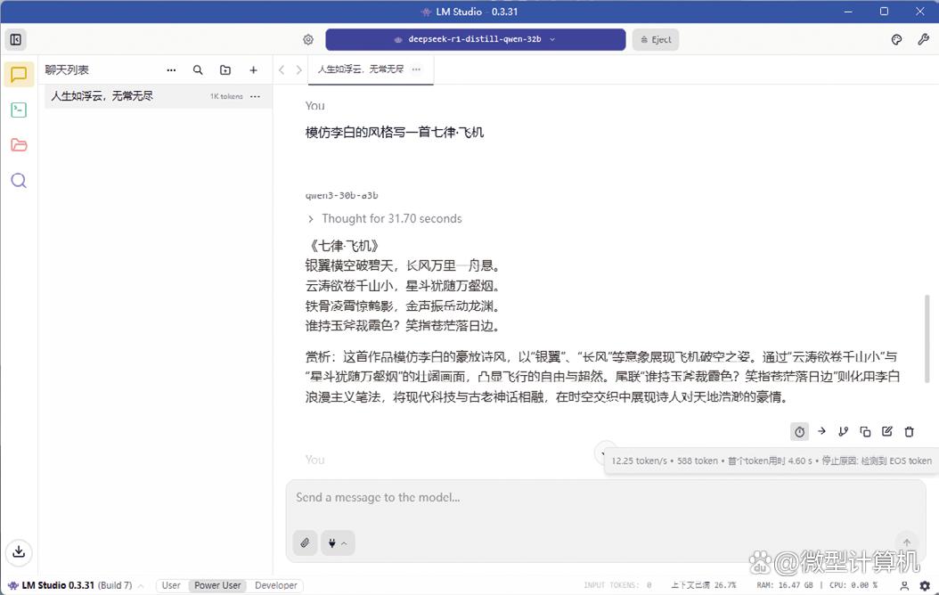 我们使用lm studio软件部署了多个当前热门的大模型进行实测。在运行q4量化版的qwen3-30b-a3b模型时,该主机达到了12.25 tokens/s的推理速度,整体响应流畅,体验良好。