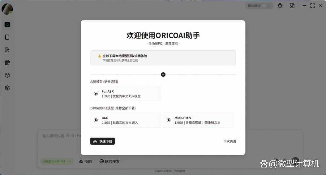 打开app并登录后,界面会提示下载基于asr模型(语音识别)和embedding模型(包含beg长语义的文本嵌入和minicpm-v多模态理解)。该app中的应用商城提供了目前市面上主流的ai工具,比如国内常见的qwen、豆包、纳米ai和腾讯元宝,还有国外的chatgpt、gemini以及stable diffusion等。这都不是重点,最关键的是该app支持部署本地ai大模型,比如可以直接在模型商店一键下载部署qwen3:14b、deepseek-r1:14b、qwen3-30b-a3以及最新的qwen3:30b-a3b-2507等大模型。值得注意的是,像30b这类较大规模的大模型在现有的硬件配置上无法直接下载部署,需要用户升级更大的内存后才能使用。对于日常办公、学习来说,14b的模型就能满足使用。