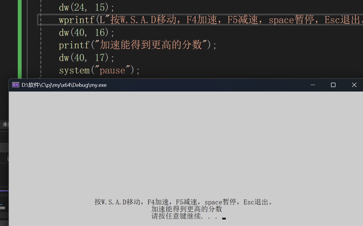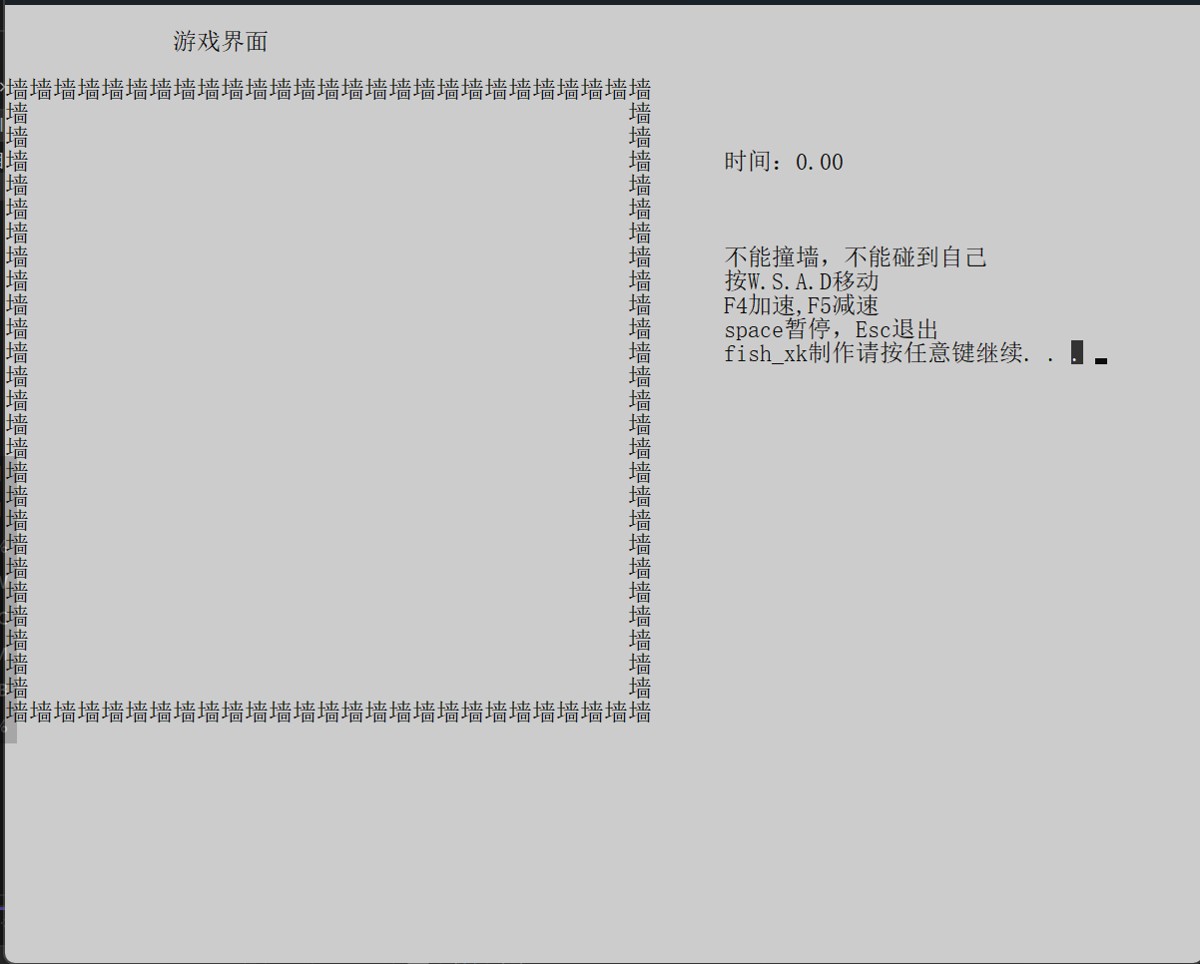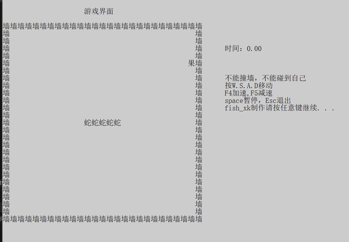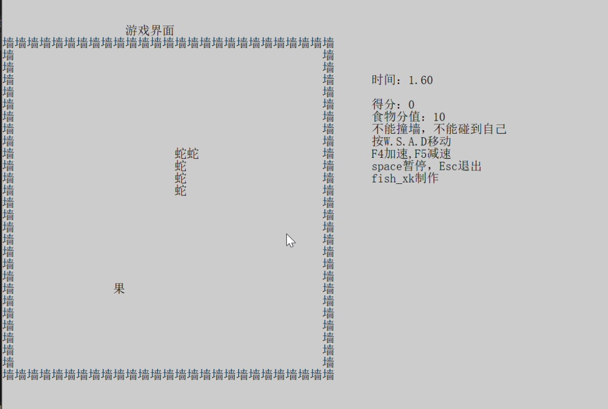 dw(60, 6); wprintf(l"时间:%.2f", sj); dw(60, 10); wprintf(l"不能撞墙,不能碰到自己"); dw(60, 11); wprintf(l"按w.s.a.d移动\n"); dw(60, 12); wprintf(l"f4加速,f5减速\n"); dw(60, 13); wprintf(l"space暂停,esc退出"); dw(60, 14); wprintf(l"fish_xk制作");