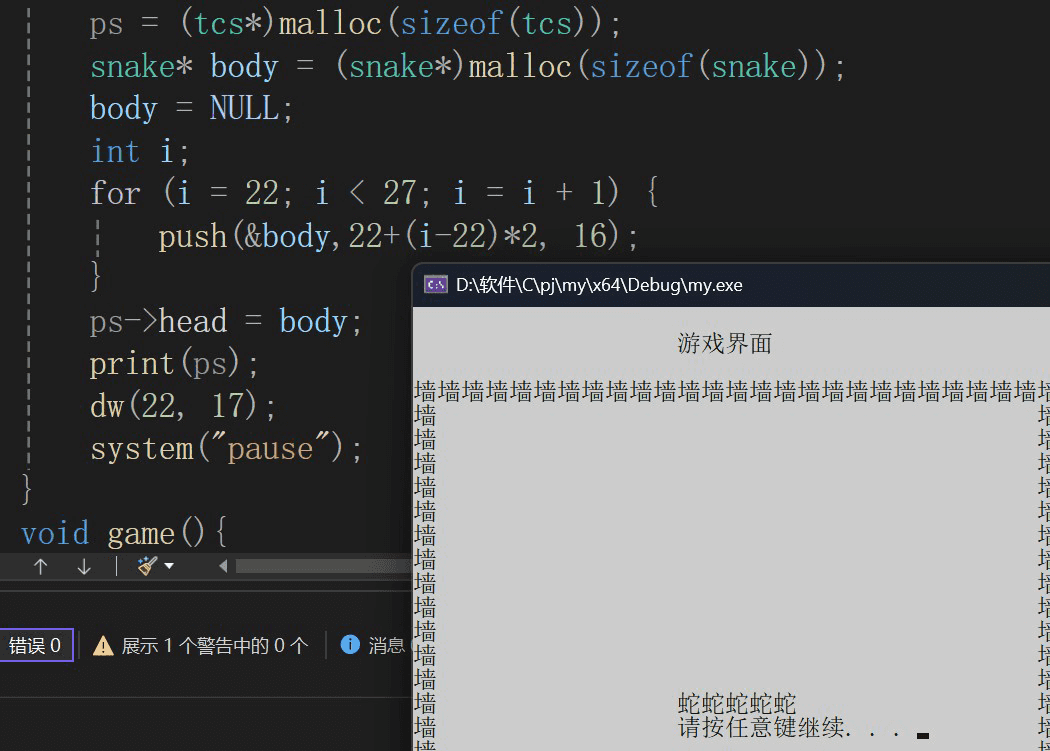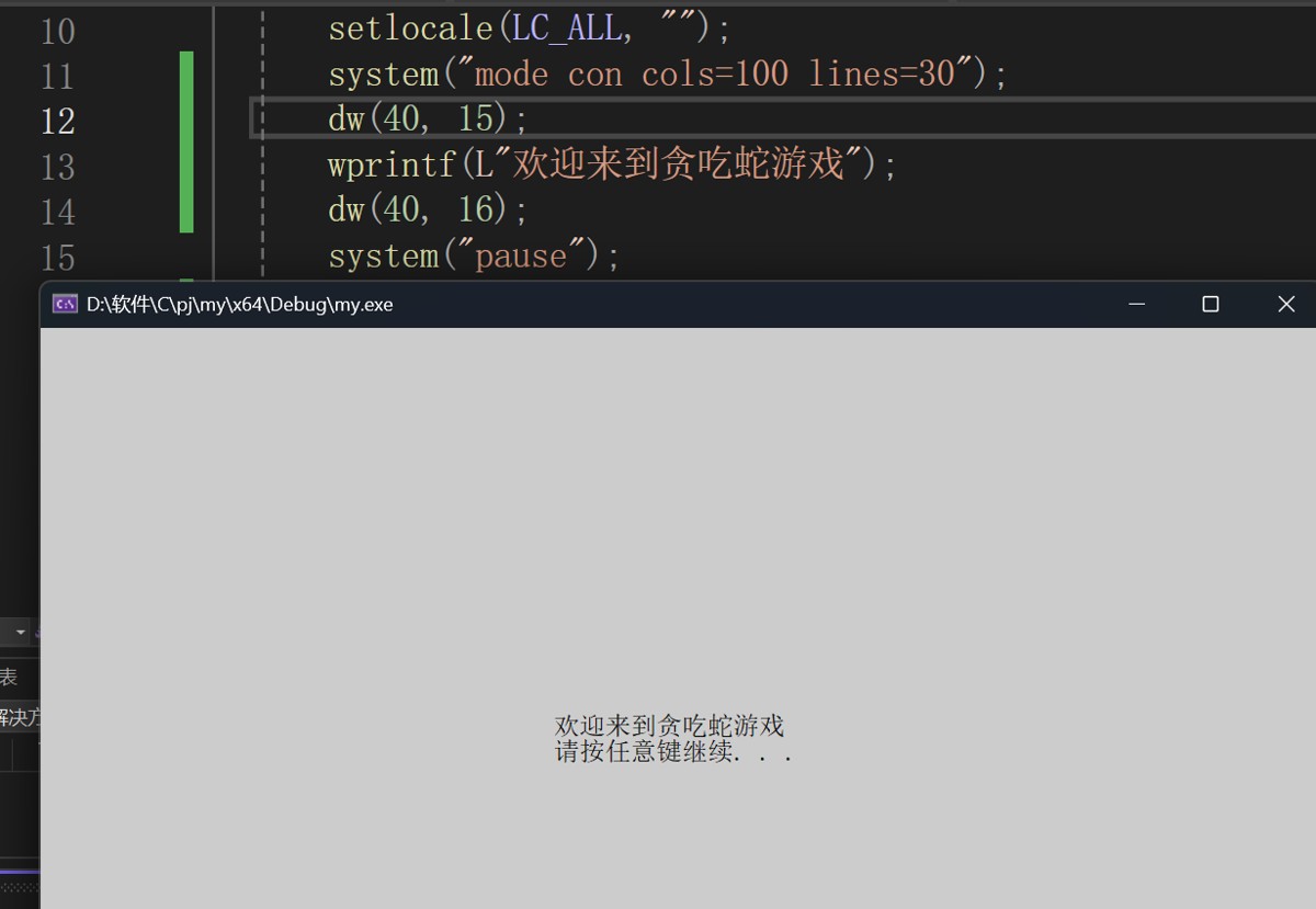 wprintf(l"欢迎来到贪吃蛇游戏");//用wprintf来输出宽字符,l表示后面的是宽字符,如中文等。