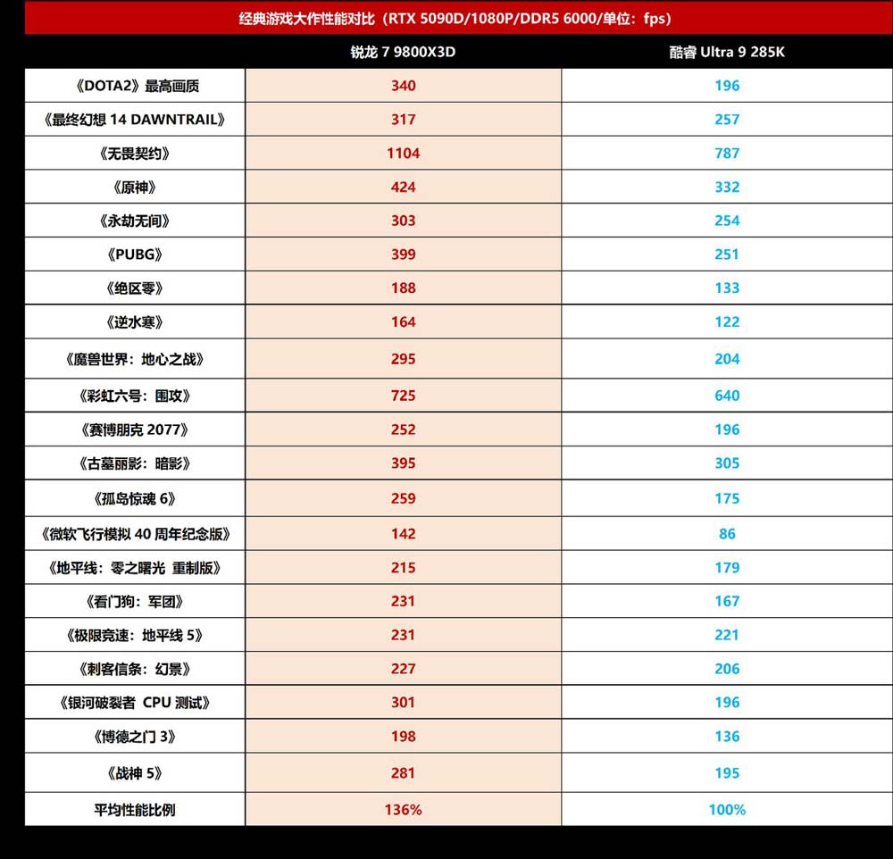 虽说酷睿ultra 9 285k拥有24个核心,但其中游戏能用的大核只有8个,多达16个小核白白浪费了,再加上三级缓存、内存延迟方面的劣势,使得在游戏性能上大幅落后于锐龙7 9800x3d,差距相当明显。