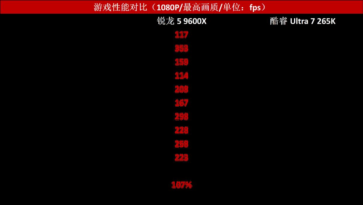 锐龙5 9600x的表现很好地诠释了玩游戏不是核心越多就越好的观点,其6个全大核的配置在高效架构、较高频率、更大三级缓存以及更低内存延迟的加持下,综合表现胜过20核酷睿ultra 7 265k的7%,具备更强的游戏性能。