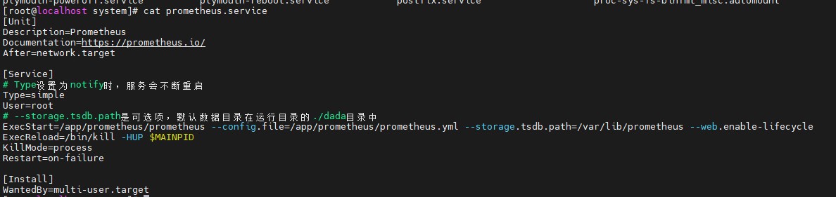 [unit] description=prometheus documentation=https://prometheus.io/ after=network.target [service] # type设置为notify时,服务会不断重启 type=simple user=root # --storage.tsdb.path是可选项,默认数据目录在运行目录的./dada目录中 execstart=/app/prometheus/prometheus --config.file=/app/prometheus/prometheus.yml --storage.tsdb.path=/var/lib/prometheus --web.enable-lifecycle execreload=/bin/kill -hup $mainpid killmode=process restart=on-failure [install] wantedby=multi-user.target