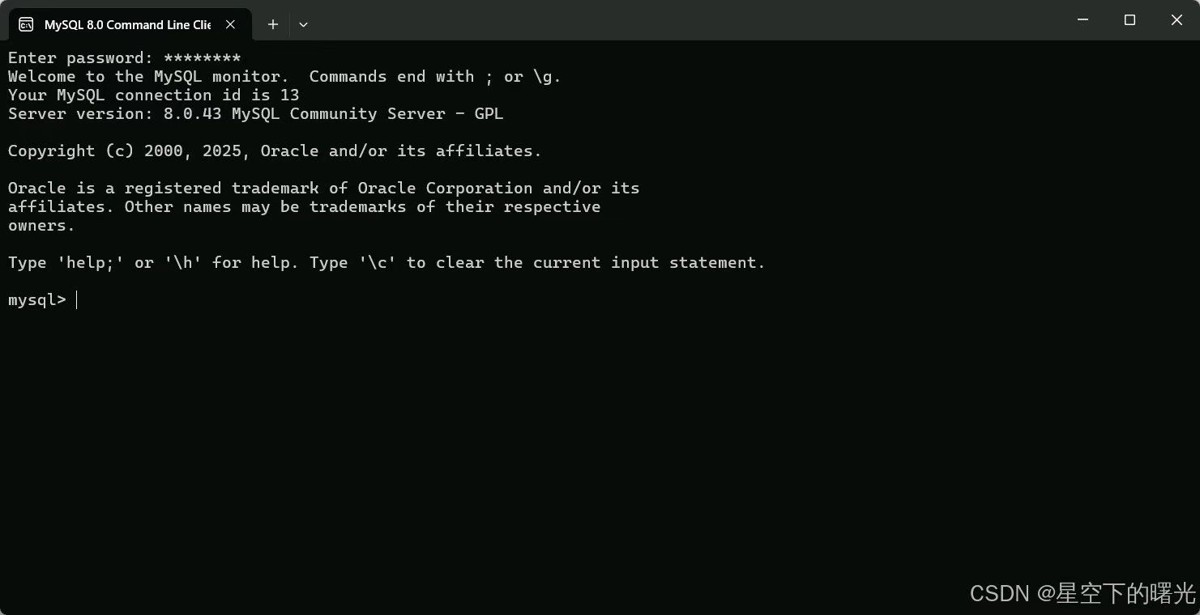 在终端运行mysql -u root -p测试连接,若成功则初始化完成。显示如下: