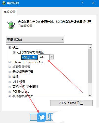 5、最后,在弹窗的窗口中,依次点击打开“硬盘-在此时间后关闭硬盘”,设置时间为“从不”,点击确定即可。