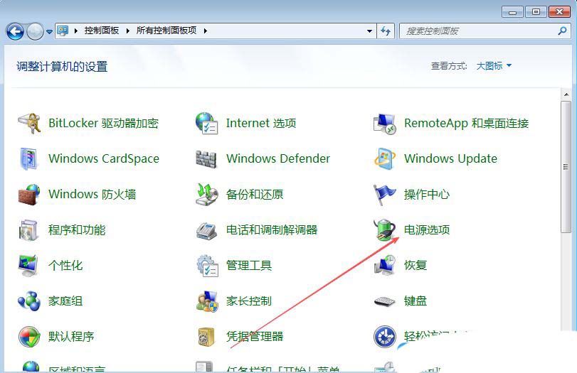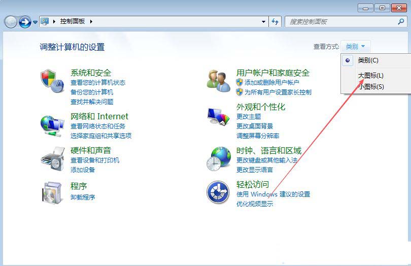 1、首先,打开win7系统的控制面板界面,设置“查看方式”为“大图标”。