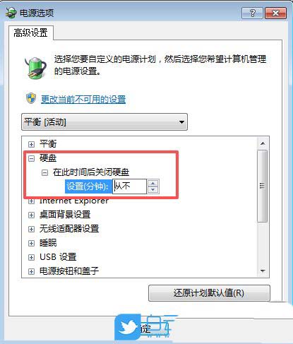 5、最后,在弹出的窗口中,设置“硬盘-在此时间后关闭硬盘”时间为“从不”,点击确定应用即可。