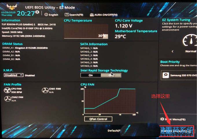 1、开机或重启电脑,也就是在出现华硕logo的时候,按 del键进入 bios 界面,接着选择 advanced mode (f7) ,进入基本菜单设置;