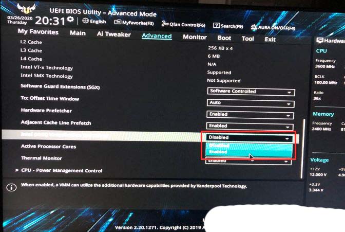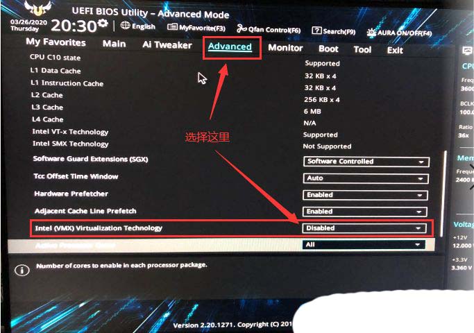 2、选择 advanced 设置,并找到 intel (vmx) virtuallzation technology 设置项;
