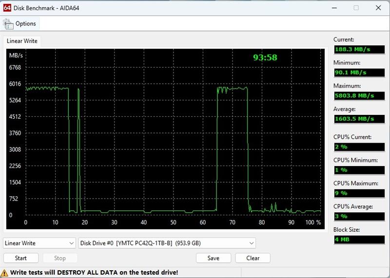这是pc42q 1tb的测试成绩,整个测试耗时93分钟,平均写入速度1603mb/s、最高为5803mb/s。