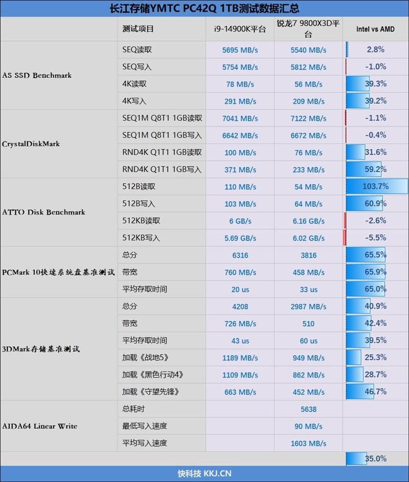 pc42q 1tb ssd的各项指标都表现非常出色,可以说是qlc ssd划时代的产品,当然还是优先推荐搭配intel平台,除了少数指标有些许落后,大部分都大幅领先。
