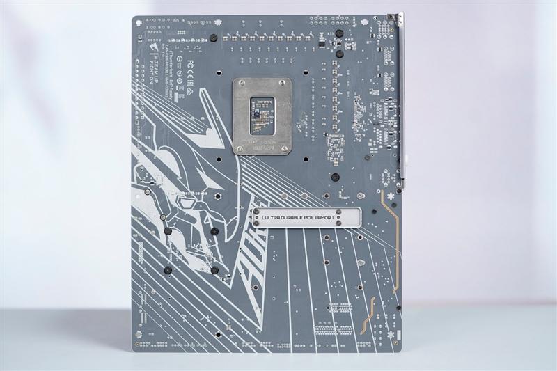 技嘉z890 aorus xtrme ai top主板的背面采用了银灰色设计,印有大面积的aorus图案和logo。