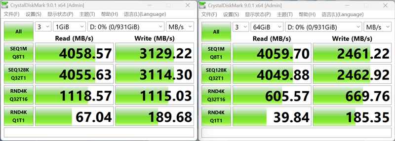 在crystaldiskmark测试中,lacie rugged ssd4金刚钻plus的连续读写速度直接突破4000mb/s,写入速度也能超过3000/s,1gb和64gb测试结果差别不大。