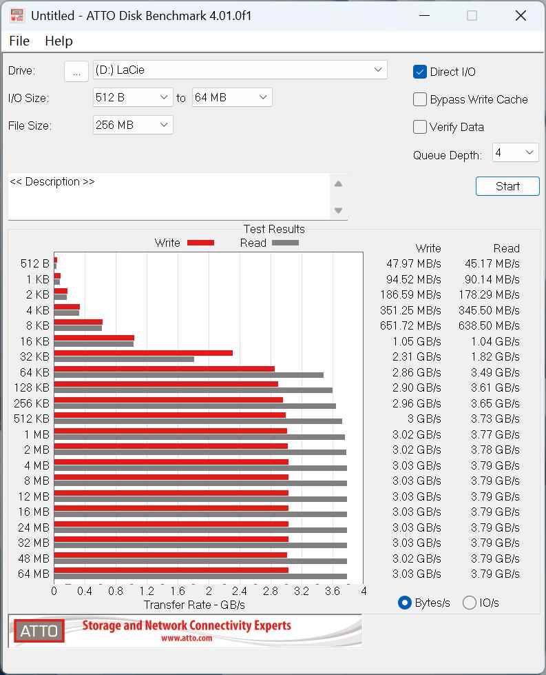 lacie rugged ssd4金刚钻plus在attd disk benchmark测试中,0.5k的小文件也能有超过45mb/s的速度,从16k文件开始读写速度超过1gb/s,从64k文件看是读写速度都超过了3gb/s,性能达到最高水平。