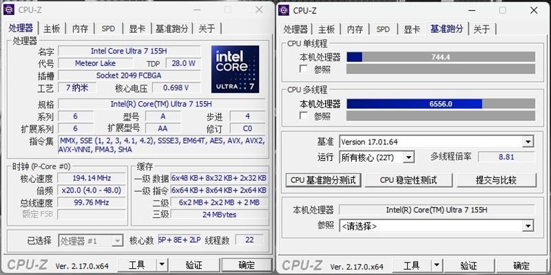 酷睿ultra 7 155h单核分数744,多核分数6556。