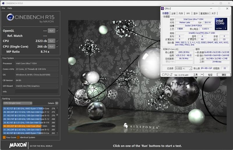 酷睿ultra 7 155h单线程分数266b,多线程分数2323cb。