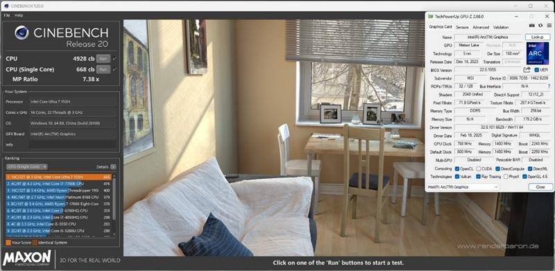 在cinebench r20测试中,酷睿ultra 7 155h单核成绩为668cb,多核成绩4928cb。