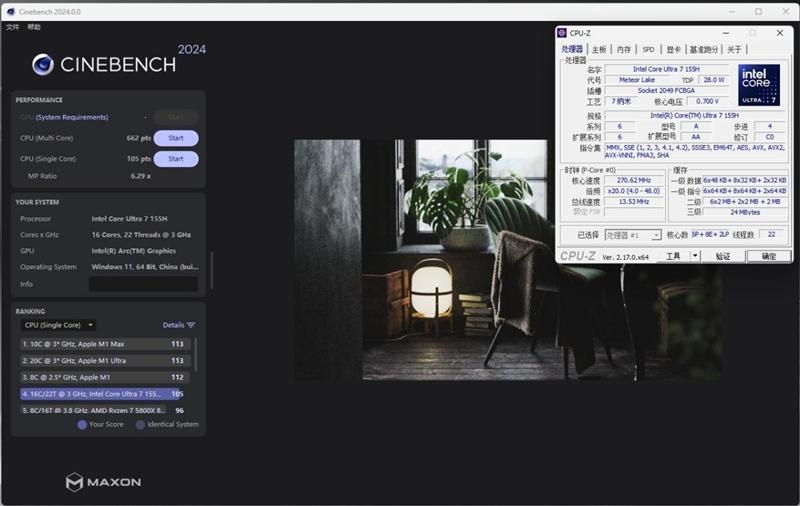 在cinebench 2024测试中,酷睿ultra 7 155h单线程跑了105pts,多线程跑了662pts。
