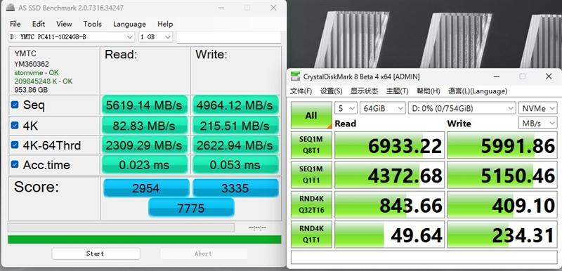 在as ssd benchmark中,这块1tb的pcie 4.0 ssd的总分为7775,顺序读写超过5619mb/s、4964mb/s,4k随机读取82mb/s,随机写入215mb/s。