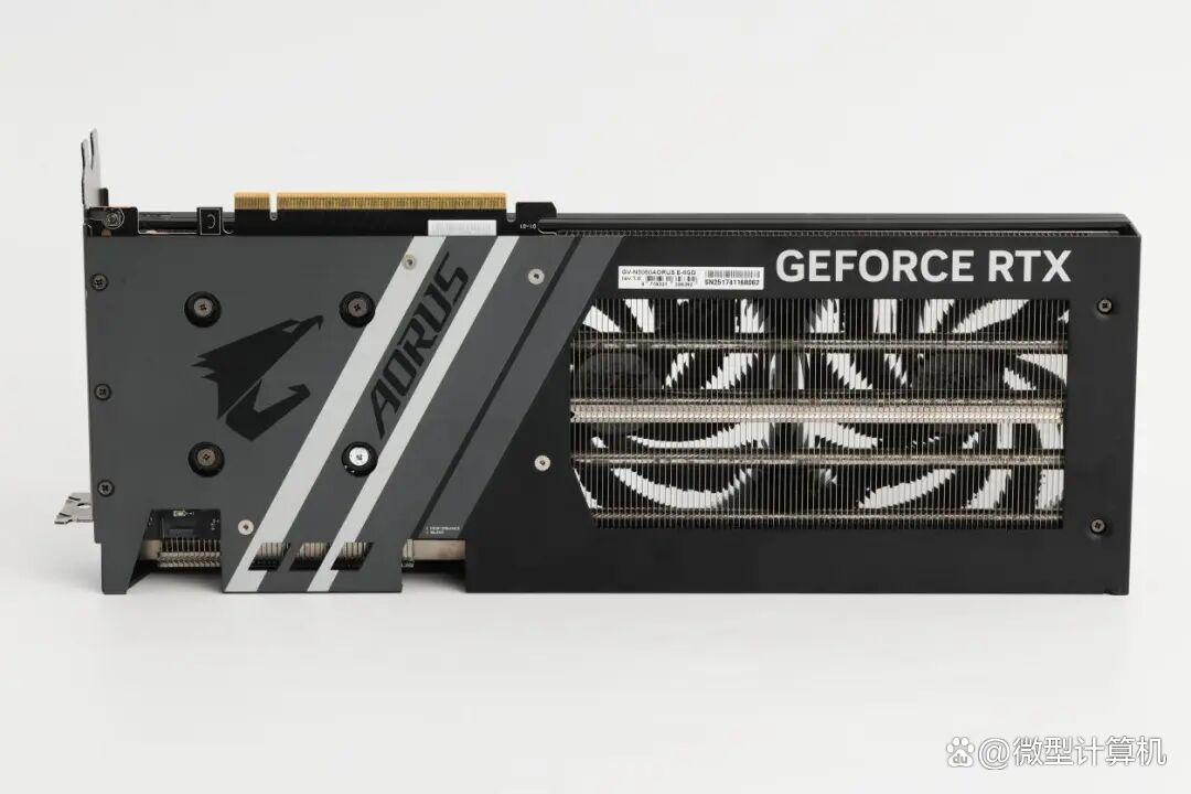 将显卡翻转查看其背部,aorus geforce rtx 5060 elite 8g采用的金属背板同样可圈可点,兼具美学价值与实用功能。背板左侧以aorus标志性的雕头元素作为核心装饰,搭配两条利落的白色线条进行区域分割,使视觉重心清晰明确,巧妙营造出层次分明、错落有致的设计感,与正面风格形成呼应又各具特色。