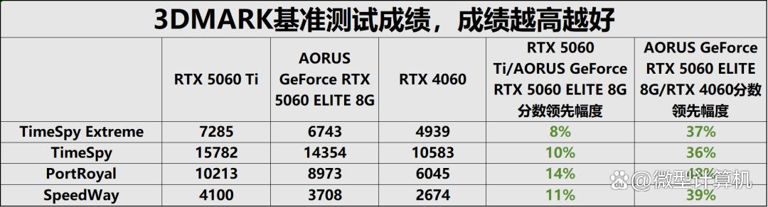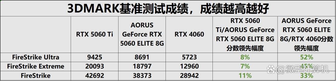 3dmark理论性能测试作为硬件性能评估的权威标准,其量化数据为剖析显卡硬件规格差异提供了客观、精准的依据。为明确技嘉aorus geforce rtx 5060 elite 8g的性能定位,我们构建了“跨代+同级”的对比体系,将其与前代对位产品rtx 4060及同级竞品rtx 5060 ti展开同台测试。实测结果清晰显示,三款显卡的综合性能呈现出层次分明的阶梯式分布,性能梯度一目了然。