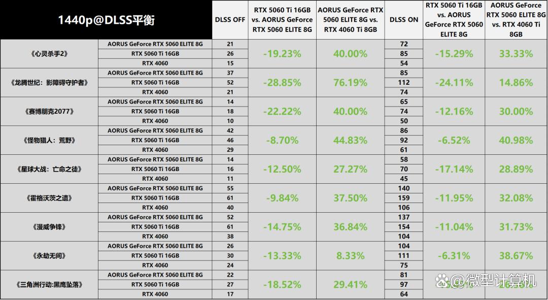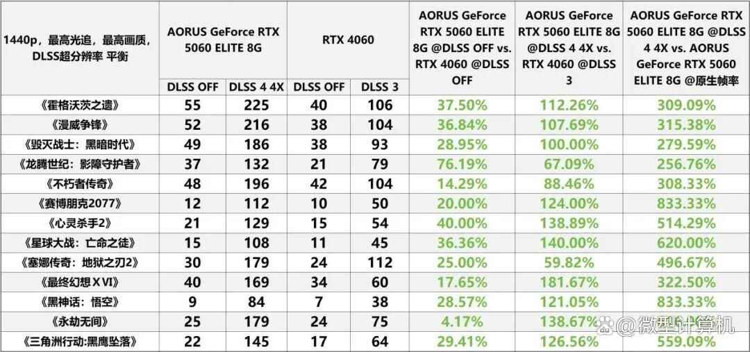 将画面分辨率提升至1440p后,技嘉aorus geforce rtx 5060 elite 8g的显卡性能表现依旧不负众望,完美契合其定位水准。在与rtx 4060的直接对决中,关闭dlss功能时,技嘉aorus geforce rtx 5060 elite 8g能够稳定实现接近32%的平均帧率领先;开启dlss功能后,帧率领先幅度维持在28%左右,整体性能优势较1080p分辨率场景更为突出——这一现象源于高分辨率下,rtx 5060系列在核心架构与显存带宽上的优势得以进一步放大。不过,与同级的rtx 5060 ti相比,技嘉aorus geforce rtx 5060 elite 8g仍存在约15%的性能落差,且这一差距较此前3dmark理论性能测试中的差异略有增大,核心原因在于高分辨率光追场景对显卡核心性能与显存容量的考验更为严苛,使得规格上的细微差距被进一步放大,形成了更为清晰的性能梯队。