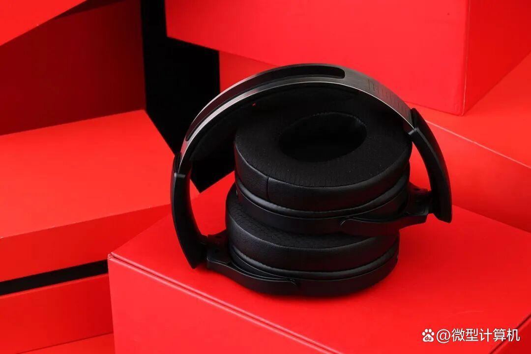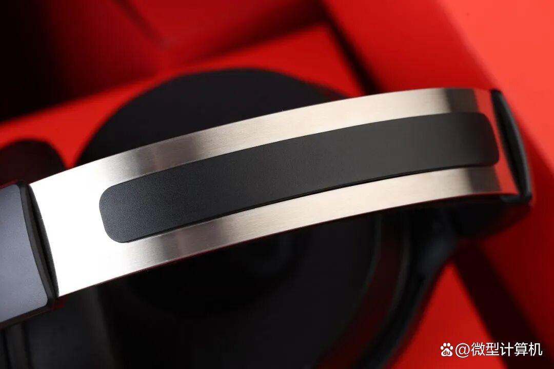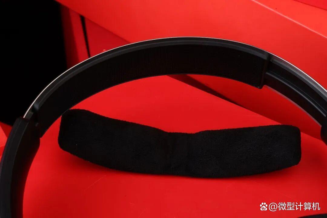 耳机主体配色以黑色为基调,头梁顶部可见部分金属构件,表面带有金属拉丝质感,外侧还设有一条硬质防擦条,兼顾实用性与质感。头梁内侧与头顶接触处,是填充了厚实记忆海绵的头垫,外部包裹着天鹅绒材质,触感柔软。