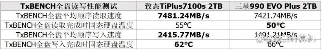 工作温度方面,在都搭配华硕b850m ayw gaming oc wifi 7 w主板ssd散热片的环境下,三星990 evo plus 2tb在完成全盘读取任务时有优势,读取2tb数据后的工作温度为50℃,致态tiplus7100s固态硬盘2tb的温度为55℃。但在功耗更大的全盘写入测试中,致态tiplus7100s固态硬盘2tb的表现更好,完成2tb数据写入后的工作温度为62℃,三星990 evo plus 2tb的工作温度则达到66℃。