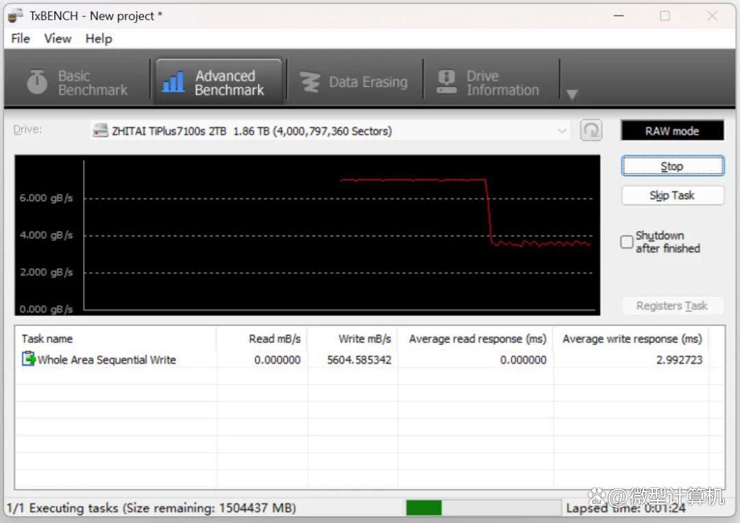 三星990 evo plus 2tb方面,尽管它的容量同样有2tb,但三星为它设置的slc缓存容量并不大,只有约216gb。在这个容量范围内写入,它可以输出5000mb/s~6100mb/s的顺序写入速度。不过一旦写入容量超过216gb,其写入速度就会大幅跌落到1154mb/s~1500mb/s之间,且不会有性能恢复阶段,一直以较低的速度持续写入直到完成全盘写入。因此它的全盘平均顺序写入速度并不高,只有1491.21mb/s,致态tiplus7100s固态硬盘2tb领先其达62%,拥有压倒性的优势。