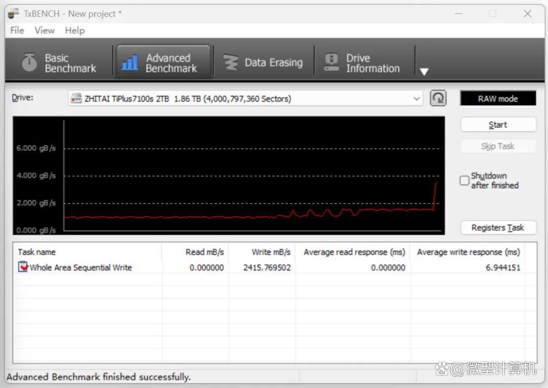 ▲致态tiplus7100s固态硬盘2tb的全盘平均顺序写入速度达到2415.77mb/s