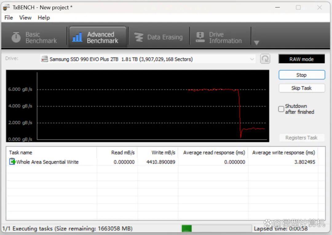 ▲三星990 evo plus 2tb的slc缓存容量只有216gb,耗尽后,其写入速度就维持在1154mb/s~1500mb/s之间。
