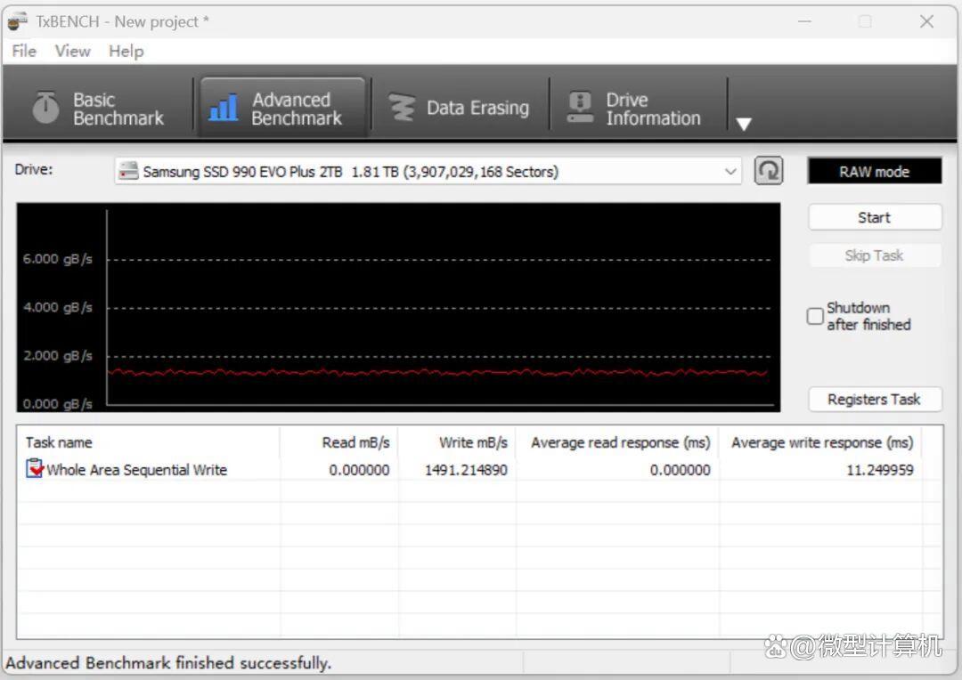▲三星990 evo plus 2tb的全盘平均顺序写入速度只有1491.21mb/s