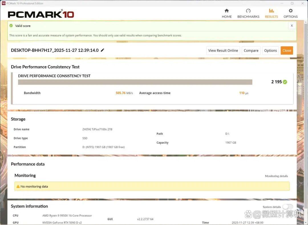 ▲致态tiplus7100s 2tb的pcmark 10磁盘性能一致性测试成绩,远优于三星990 evo plus 2tb。